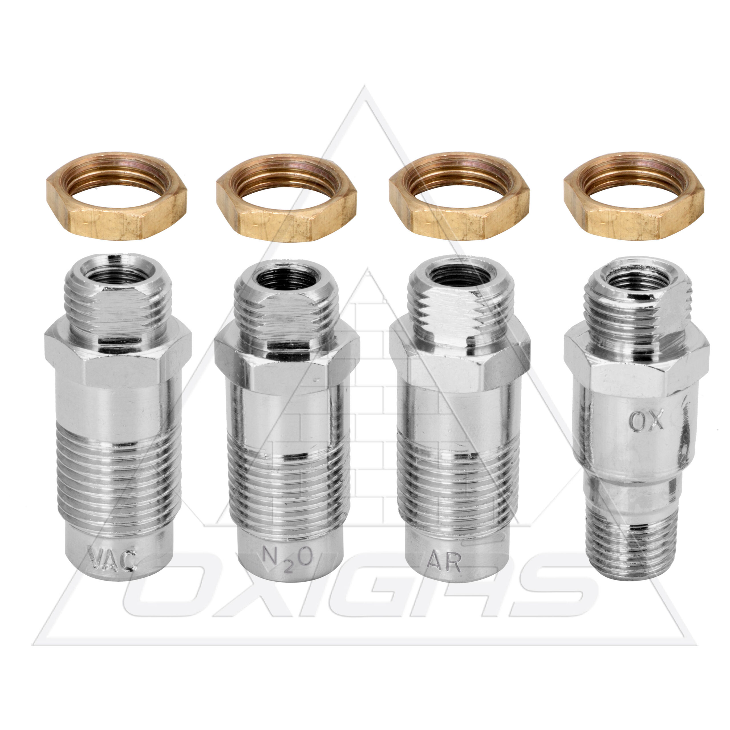 Bico de saída de gases medicinais com porca para régua, Oxigênio, Ar comprimido, Vácuo e Óxido nitroso.